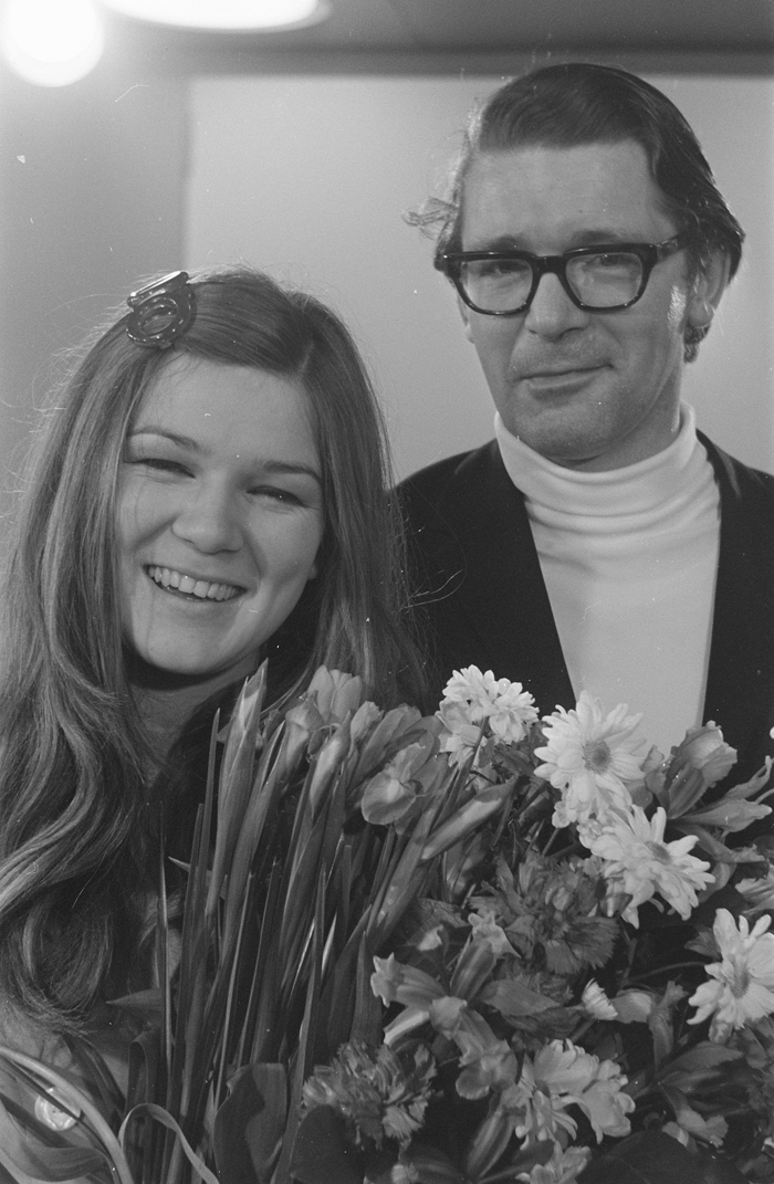 Lenny Kuhr en schrijver David Hartsema na de gedeelde Nederlandse overwinning op het Eurovisiesongfestival 1969
